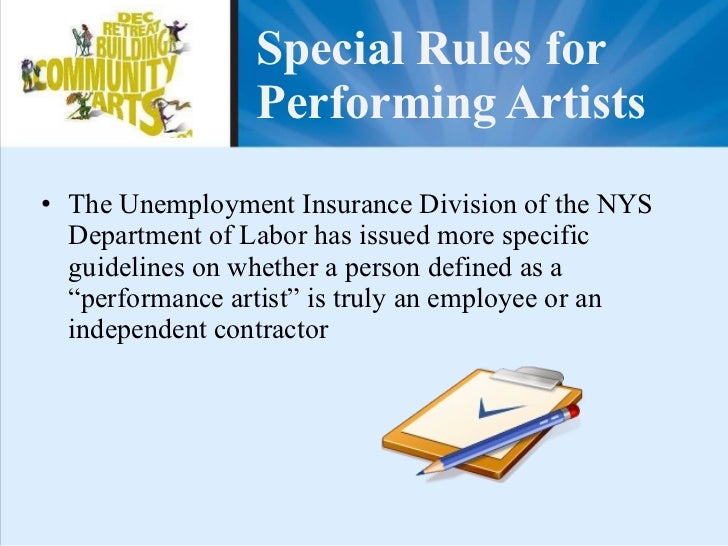 The following are guidelines used by the Unemployment Insurance Division, the Division of Labor Standards and the Division of Safety and Health to establish whether the relationship between a performing artist and the party engaging the services is an employment relationship or that of an independent contractor. ... Access Content